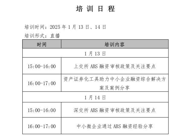 培训时间为2025年1月13日、14日15:00-17:00,内容包括上交所和深交所ABS融资审核政策及关注要点、资产证券化工具助力中小企业融资综合解决方案及案例分享、中小微企业ABS融资案例分享,邀请交易所相关业务负责人、行业机构专家及企业代表授课。