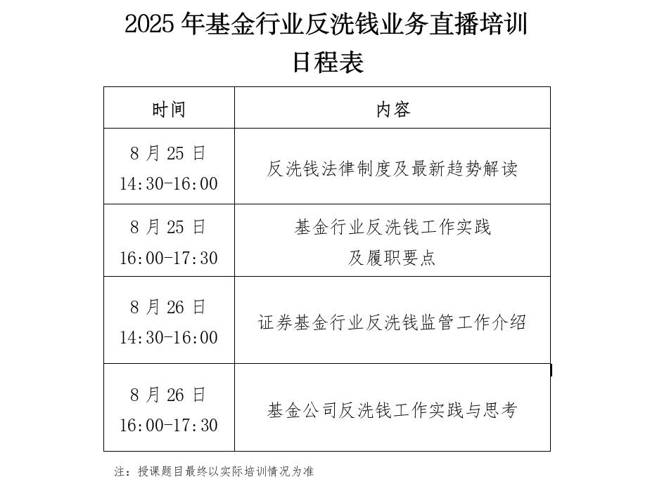 培训时间为8月25日至26日14:30-17:30,内容包括反洗钱相关政策解读、基金行业反洗钱工作实践及履职要点、基金行业反洗钱监管工作介绍、基金公司反洗钱工作实践与思考等,邀请人民银行、证监会相关业务负责人及行业专家授课,具体日程详见附件。
