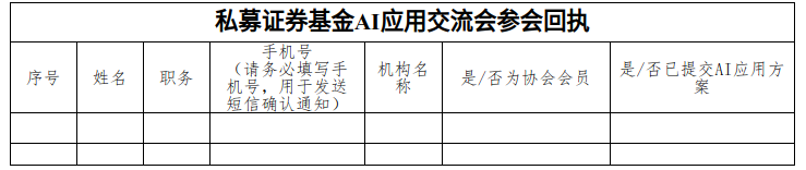 请有意愿参加的私募证券基金管理人于8月26日17:00前反馈参会回执(附件)至协会邮箱:fintech@amac.org.cn,每家可报1-2名熟悉技术、业务的高管参会,邮件主题请统一命名为“私募证券基金AI应用交流会参会回执”。因场地名额有限,协会将结合报名情况确认参会机构,并向相应报名人员发送报名成功确认短信(包括会议具体时间及地点),请各机构届时凭短信到场参会。